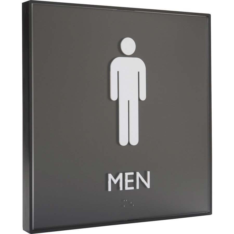 Restroom sign for men features a sturdy frame that’s made of durable plastic to provide a lasting display that will hold up for years. Male pictogram and capital letters that display the word men are colored white and positioned on a black background for a professional look. ADA-compliant sign also includes braille that is directly below the text to ensure everyone can read the message. Included foam tape secures instantly to surfaces for quick display in a visible location.