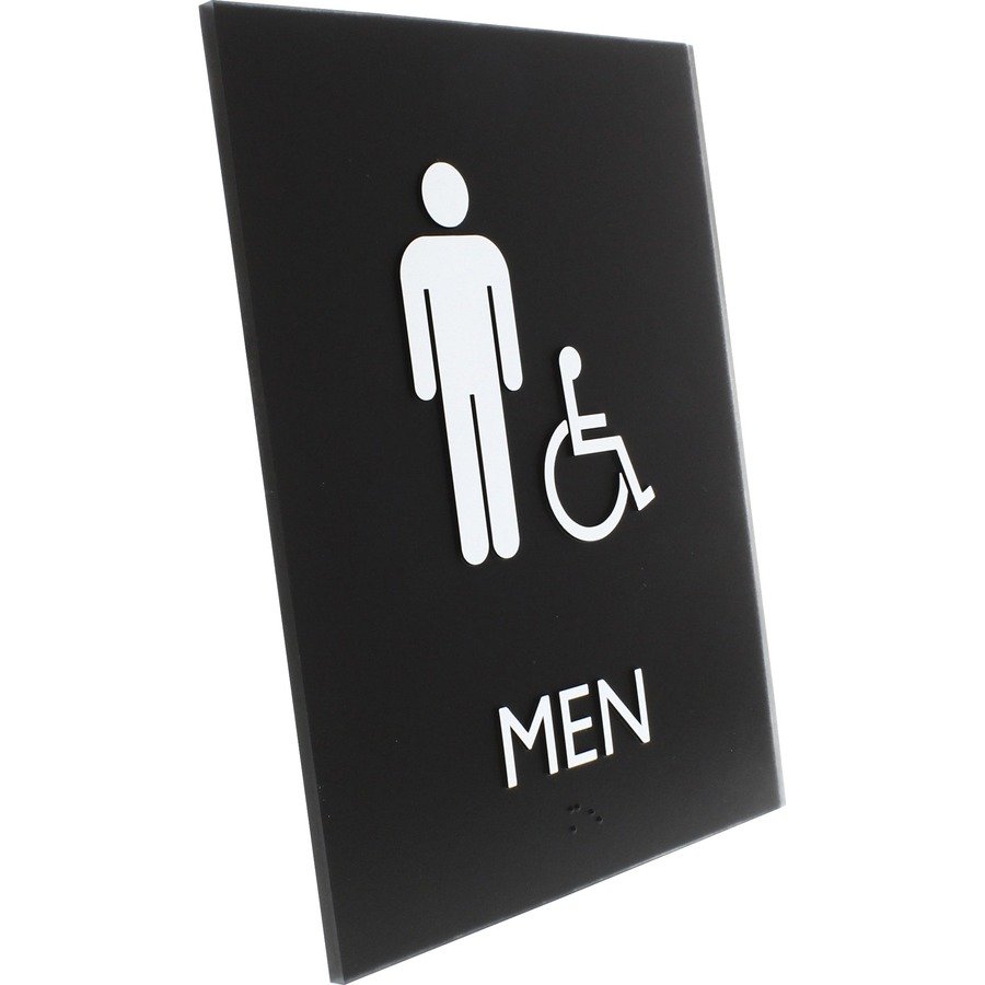 Accessible restroom sign for men features a tamper-resistant, protective lens to keep your sign looking like new for lasting readability. Male pictogram, accessible pictogram and capital letters that display the word men are colored white and positioned on top of a black background for a professional look. ADA-compliant sign also includes braille that is directly below the text to ensure everyone can read the message. Included foam tape secures instantly to surfaces for quick display in a visible location.
