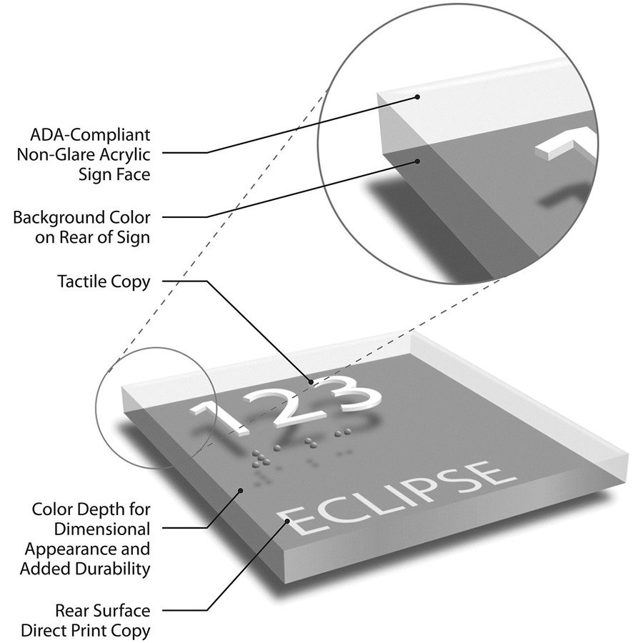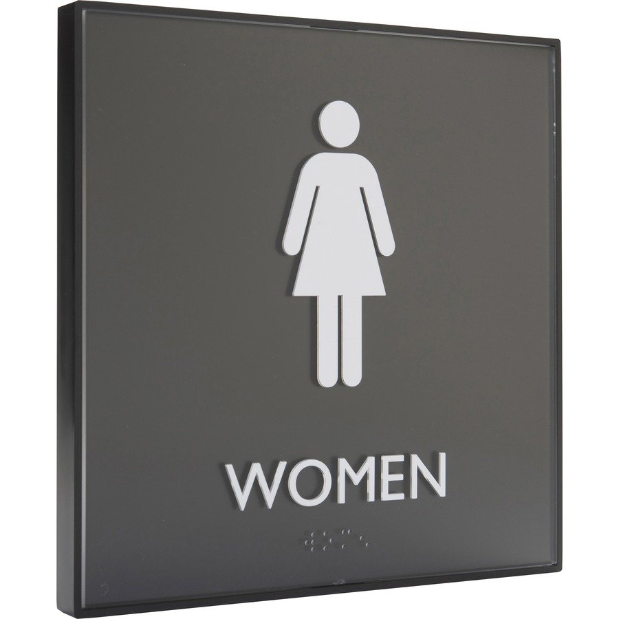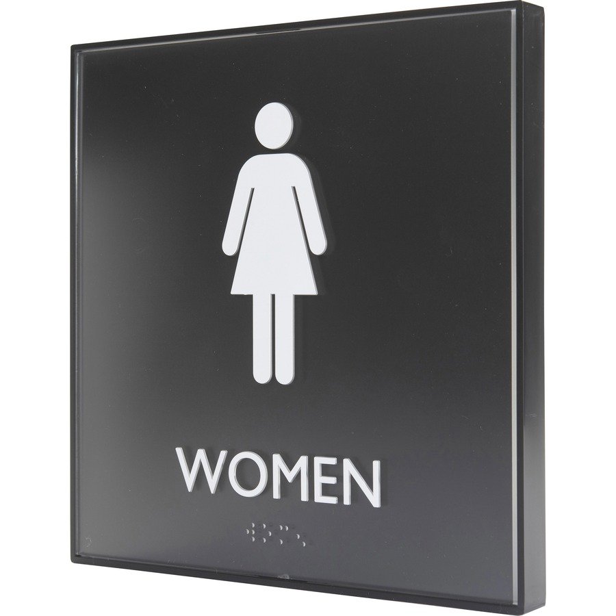 Restroom sign for women features a sturdy frame that’s made of durable plastic to provide a lasting display that will hold up for years. Female pictogram and capital letters that display the word women are colored white and positioned on a black background for a professional look. ADA-compliant sign also includes braille that is directly below the text to ensure everyone can read the message. Included foam tape secures instantly to surfaces for quick display in a visible location.