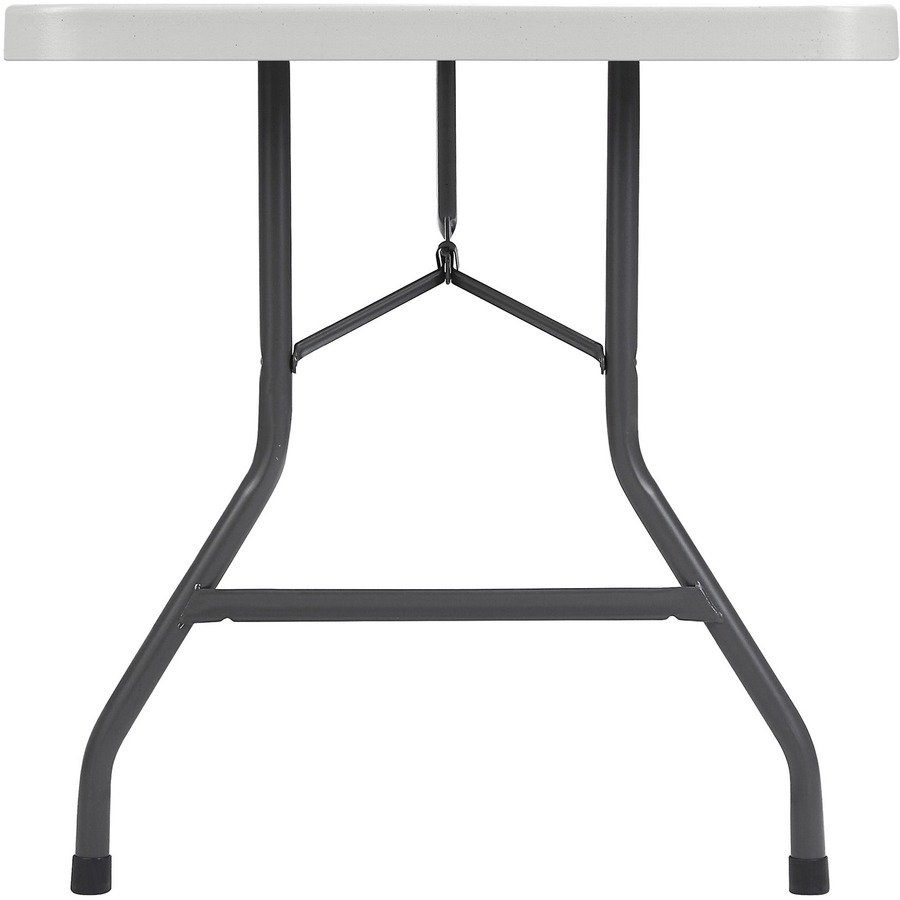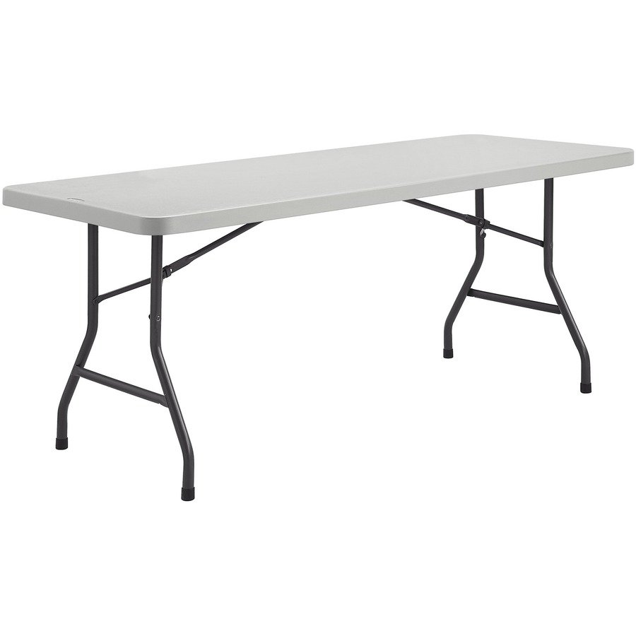 Folding table provides extra tabletop space for meetings, displays or luncheons. It is a lighter than standard solid-core tables for easier portability. Top is made of weight-saving, blow-molded, high-density polyethylene. Heavy-duty, 2″ round steel legs are powder-coated to resist rust. The metal support brackets are riveted to the support rails to create a strong frame. Use this table indoors or outdoors. Folding table holds 1,000 lb. evenly distributed. It comfortably seats eight.