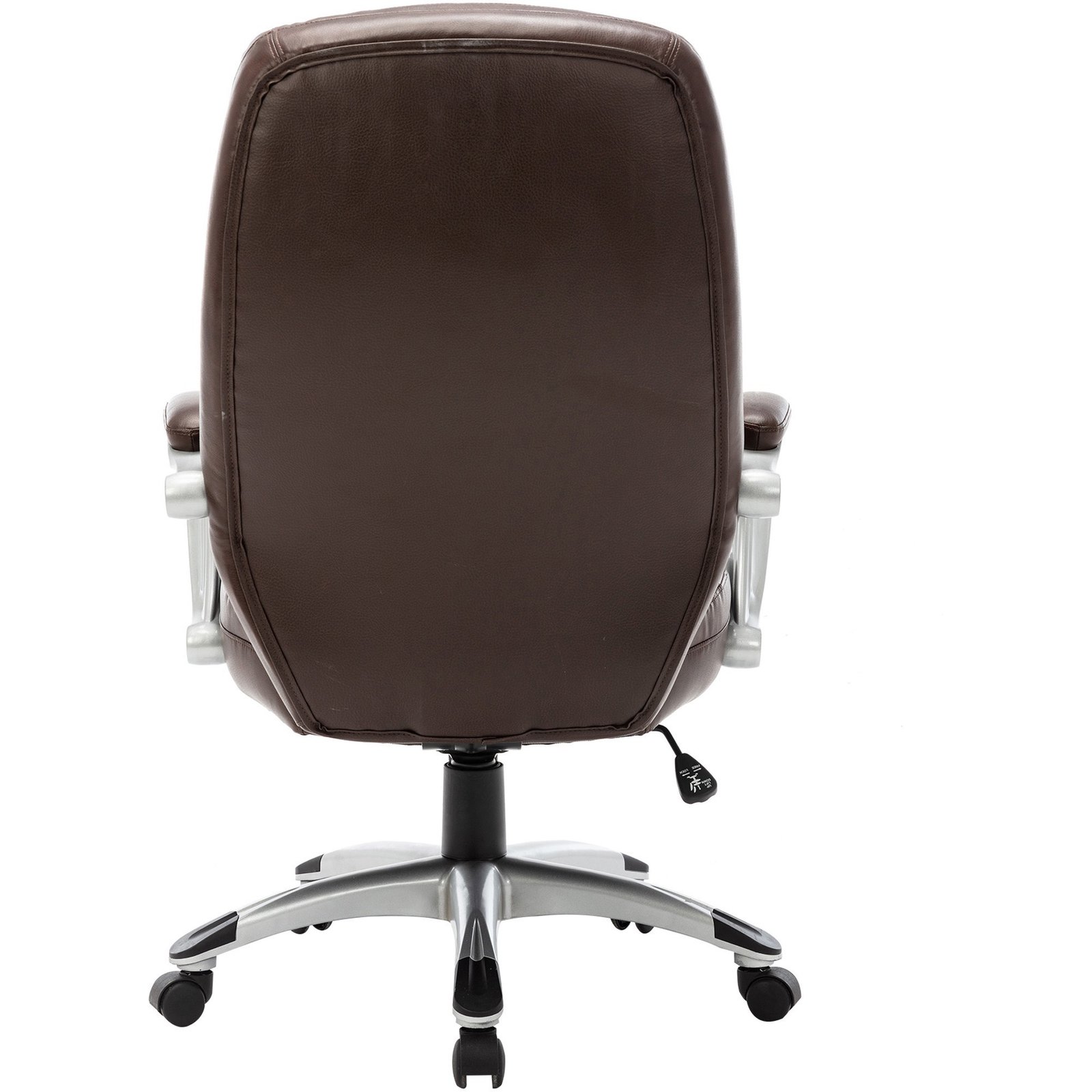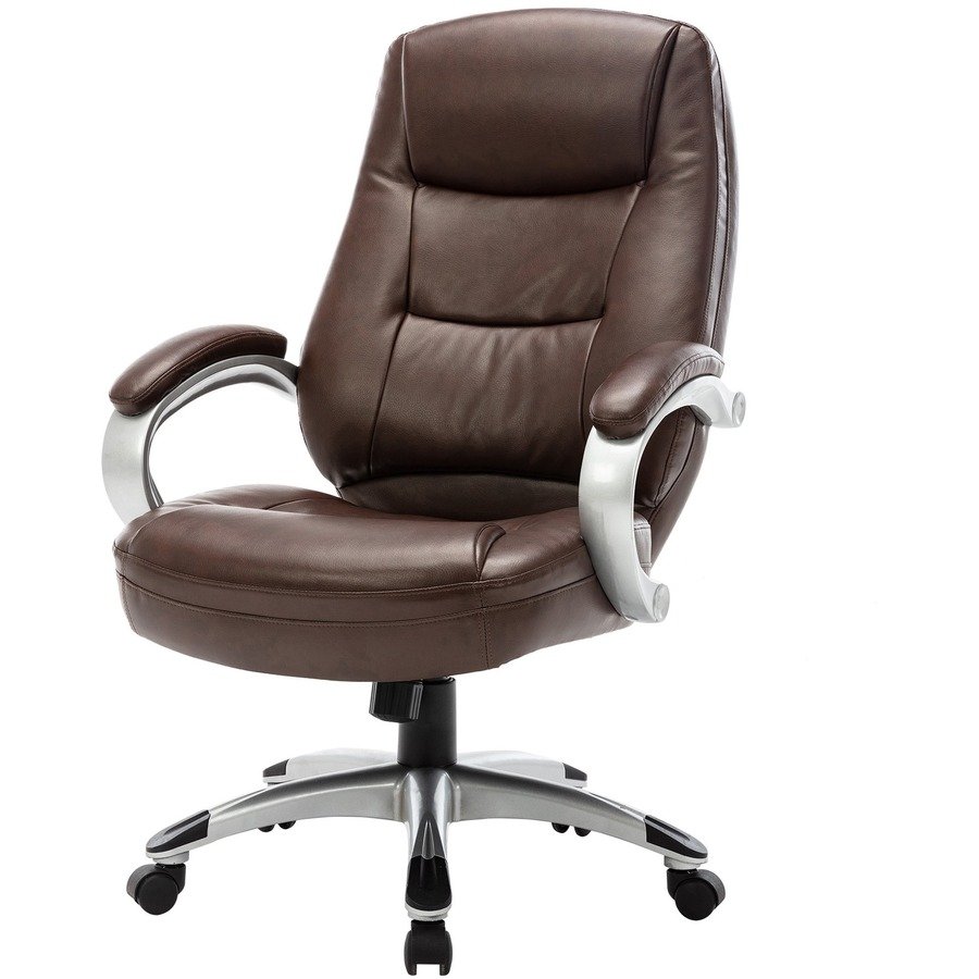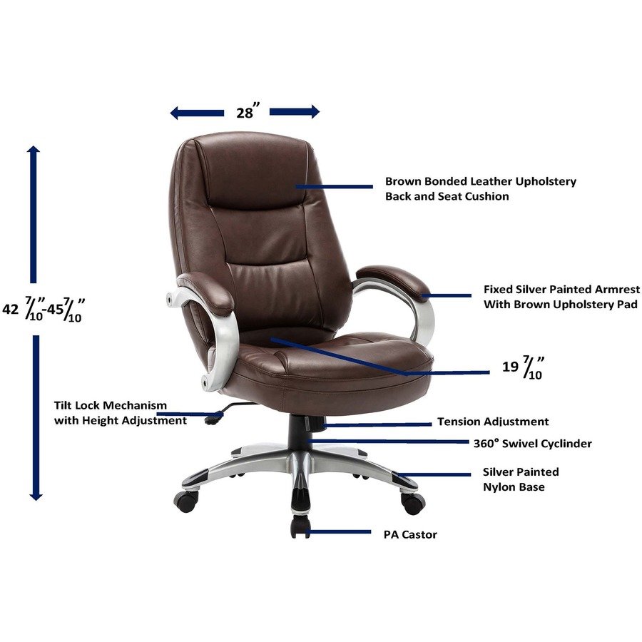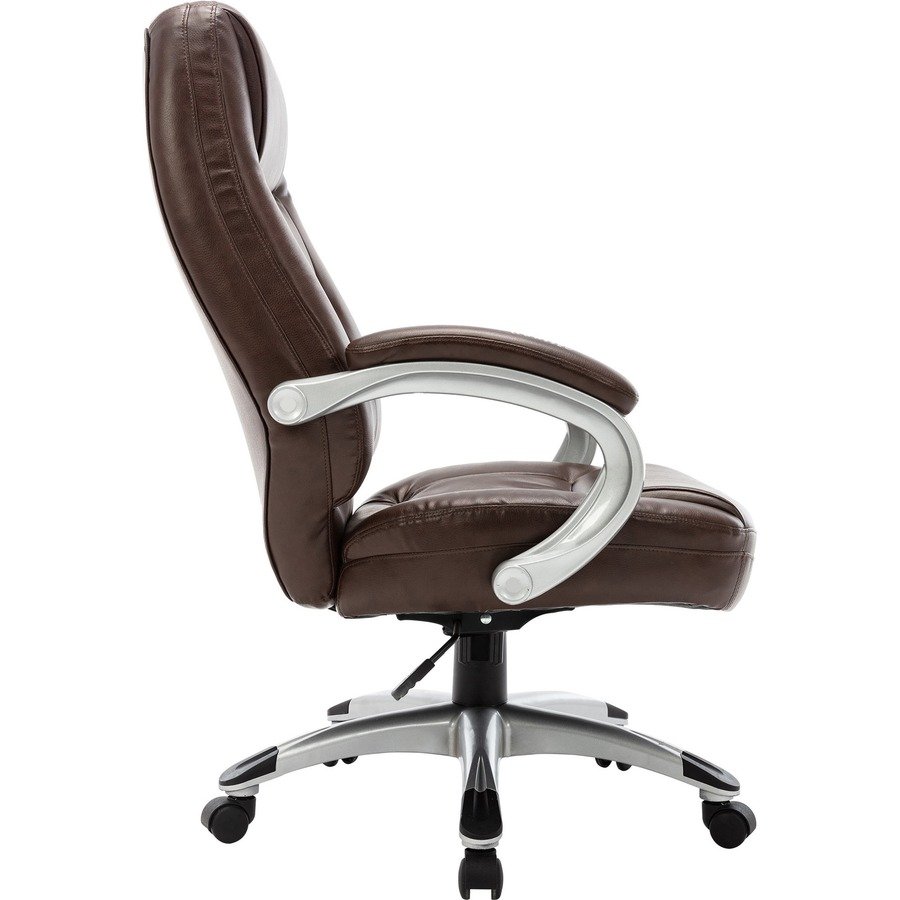 Executive high-back chair, part of the Lorell Westlake Series, features bonded leather upholstery with overstuffed cushions, a waterfall seat and padded arms for exceptional comfort. Functions include pneumatic seat-height adjustment (18-1/4″ to 21-3/4″), 360-degree swivel, tilt, tilt tension, and tilt lock. Polyurethane frame offers a champagne-colored, powder-coat finish. Seat cushion measures 21″ wide x 20-1/2″ deep. Back cushion size is 21″ wide x 29-1/4″ high. Arm height from the floor adjusts from 26-3/4″ to 30-1/4″. High-back chair meets or exceeds applicable ANSI/BIFMA standards. Meets the CA117 fire-retardant standard.