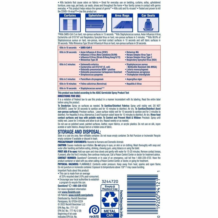 This multi-use disinfectant has a tuberculocidal, virucidal, fungicidal and bactericidal formula that kills 99.9 percent of germs on both hard and soft surfaces. It is effective against SARS-CoV-2, the virus that causes COVID-19, in 2 minutes when used as directed on hard, nonporous surfaces. The wide-angle spray provides coverage to large surface areas, making cleaning and disinfecting convenient. Disinfectant is ideal for eliminating odors at their source. Use on bedding, carpets, curtains, mattresses, shower curtains, upholstery, cabinets, counters, desks, floors, fixtures, furniture, showers, tables and toilet areas.