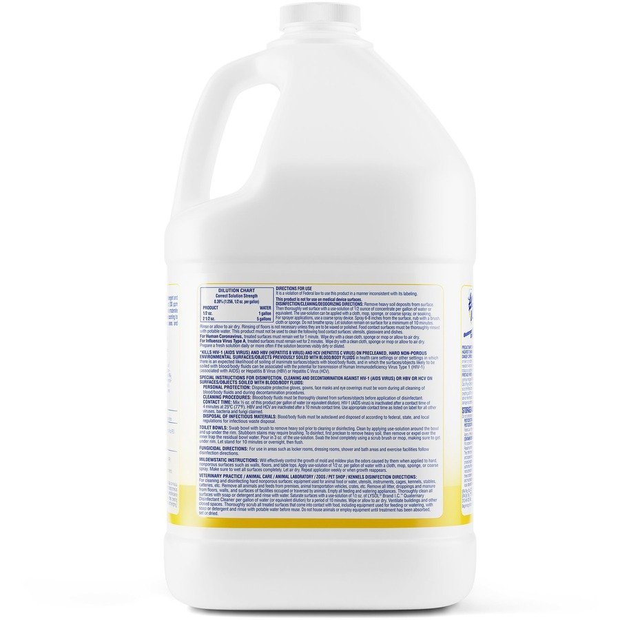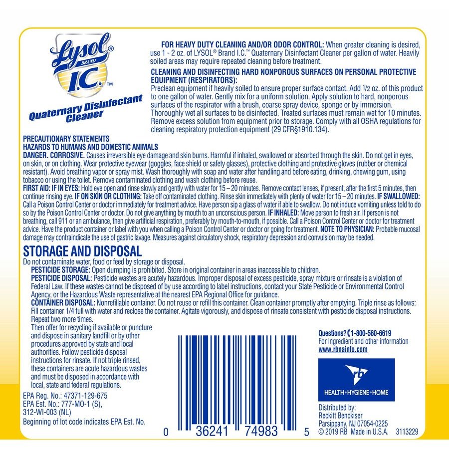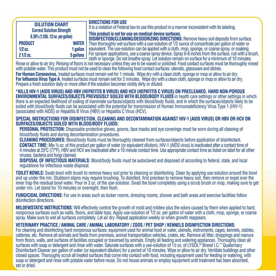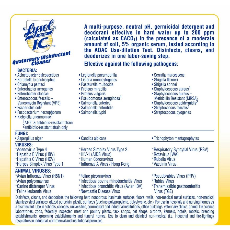 Optimize cleaning efficiency and meet hospital disinfection needs with a high-volume, multipurpose disinfectant that cleans, sanitizes and deodorizes in one step. Lysol I.C. Quaternary Disinfectant Cleaner is an economical, concentrated, neutral pH formula that supports daily cleaning. Kill 99.9 percent of viruses and bacteria (including 50 microorganisms and the virus that causes COVID-19) on hard, nonporous surfaces when used as directed. Deliver an effective clean to floors, walls, glazed porcelain, plastic surfaces, polypropylene and polystyrene. Help protect and disinfect high-traffic facilities with the versatile, germicidal detergent and deodorant that makes up to 256 gallons.