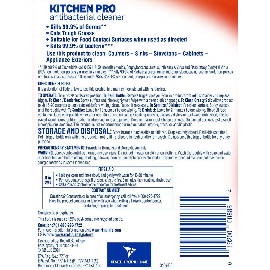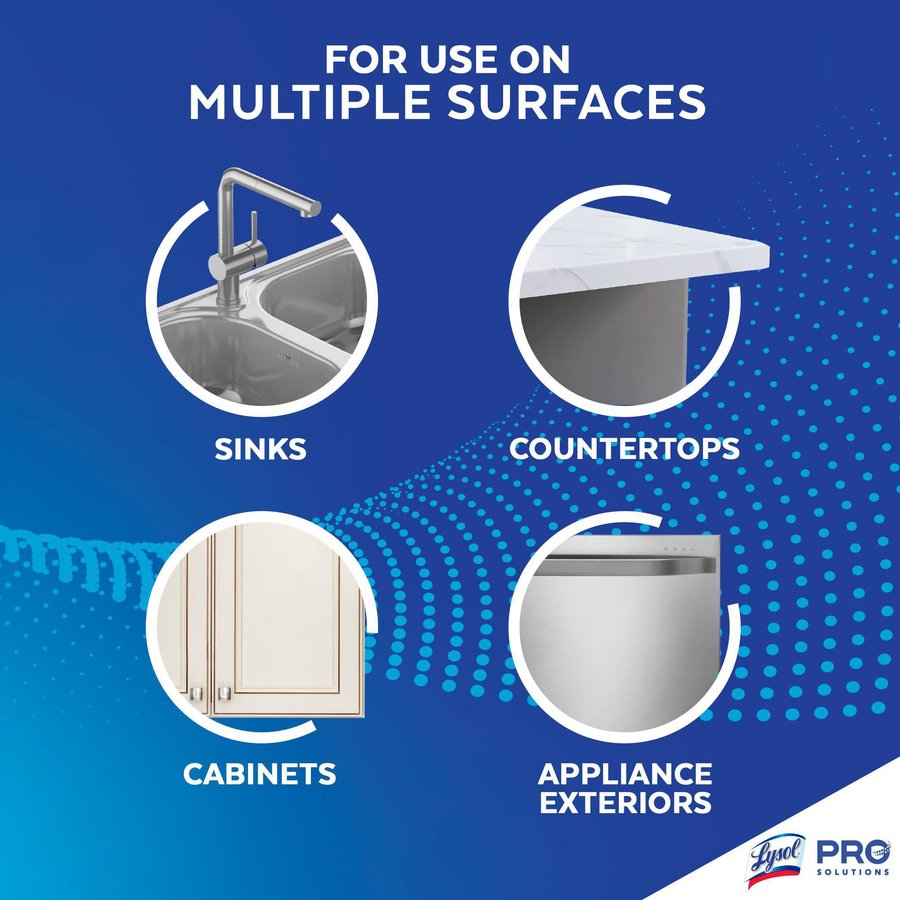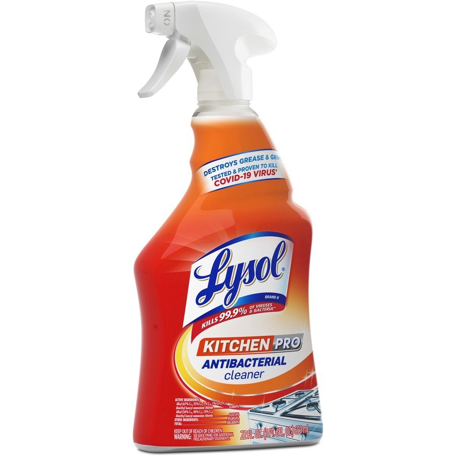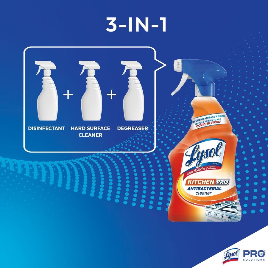 Marketing Information:Equip your staff with a versatile kitchen cleaner that disinfects, cleans and degreases in one solution. Cut through grease and grime in commercial kitchens for a deep-down clean on counters, sinks, stovetops and cabinets with Lysol Kitchen Pro Antibacterial Cleaner. Lysol kills 99.9 percent of viruses and bacteria (including Salmonella, E. coli and the virus that causes COVID-19) when used as directed on hard, nonporous surfaces.