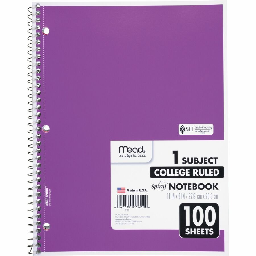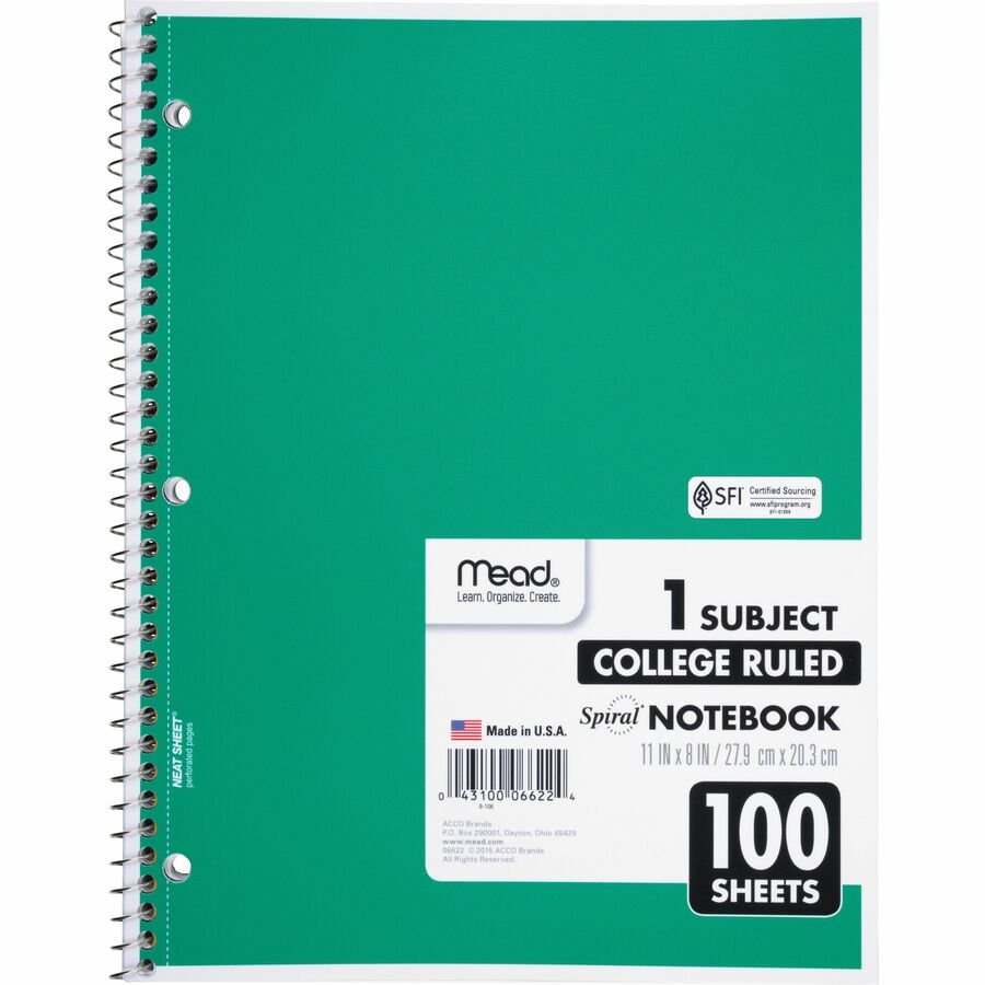 Classic, one-subject spiral notebook can always come in handy. Great for taking notes in class, recording meeting notes or keeping track of your to-dos, this notebook is up to the task. College-ruled pages maximize the available space and keep your handwriting neatly aligned. Double-sided ruling provides plenty of note-taking space. Notebook spiral binding will not snag and resists uncoiling to keep your notes together. Notebook cover is coated for durability. Perforated pages neatly and cleanly tear out paper. They are three-hole punched for notebook or paper storage within a binder. Notebook includes 100 sheets in a standard, 11″ x 8-1/2″ page size.