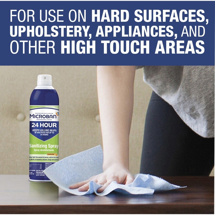 Microban 24 Sanitizing Spray kills 99.9 percent of bacteria and germs, including cold and flu viruses, on your frequently touched surfaces. It also continues working throughout the day to provide long-lasting protection for surfaces in your home or facility. This three-in-one cleaner with a Citrus scent sanitizes for 24 hours, disinfects and eliminates odors. It can be used on a variety of hard, nonfood-contact surfaces such as doorknobs, light switches and stair railings. It can also be used on soft surfaces such as couches, backpacks and coats.