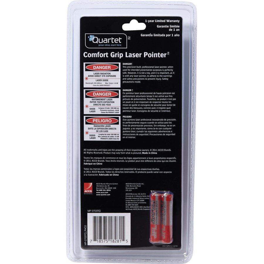 Pen-style laser pointer is enhanced with a nonslip, rubberized cushion grip for more comfortable use. Class 3a laser pointer projects a highly visible red dot over 300 yards. Bright red dot can be used on any medium, including high lumen overheads, videos and multimedia projections. Battery-operated design runs on two AAA batteries (included).