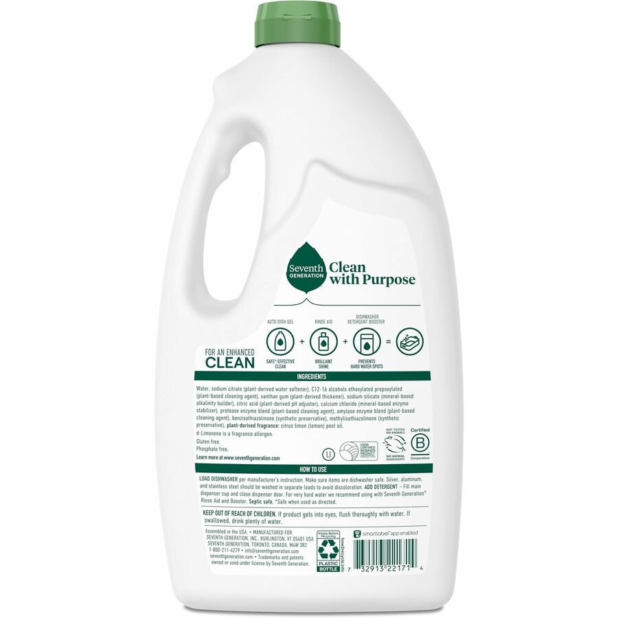 Get sparkling results from plants, not petroleum, with this Natural Automatic Dishwasher Gel. Nontoxic formula uses plant-based enzymes for greater cleaning power and makes effortless work of whatever is waiting in your dishwasher. Dishwasher gel is free of chlorine, phosphates, dyes and synthetic fragrances. Lemon scent is derived from whole essential oils and botanical extracts. Dishwasher gel is USDA Certified Bio-based 70 percent and Kosher, gluten-free and Leaping Bunny Certified. Bottle is made from a high percentage of post-consumer recycled plastic (excluding colorant).