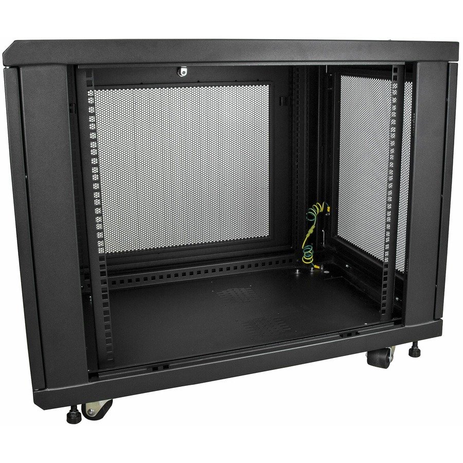 The rack features holes with covers on the ceiling and floor panels that make it easy to run cabling to the inside and outside of the cabinet, for discreet cable management. The rack also features grounding lugs that enable you to ground your equipment for added protection. This rack also includes a 1U shelf that gives you a stable surface for placing equipment that’s not rack-mountable or storing your tools.