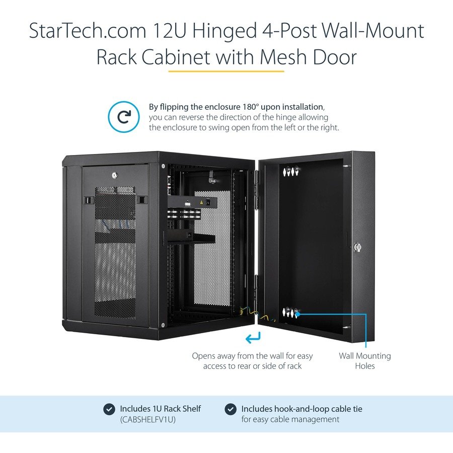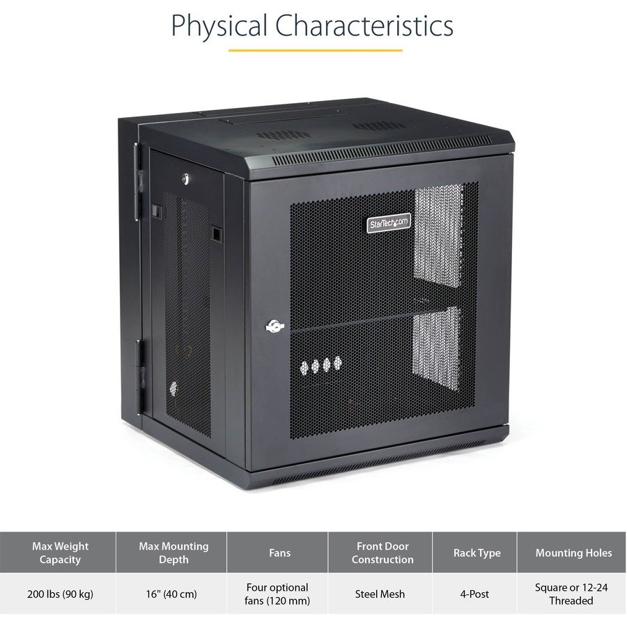 12U 19 in wall mount network cabinet – Switch depth rack enclosure – 180° hinged design – Lockable access to front rear & sides w/ 200 lb. weight cap 16in mounting depth – Pre-assembled – Includes 50 cage nuts/bolts, a shelf hook-and-loop & 4 keys