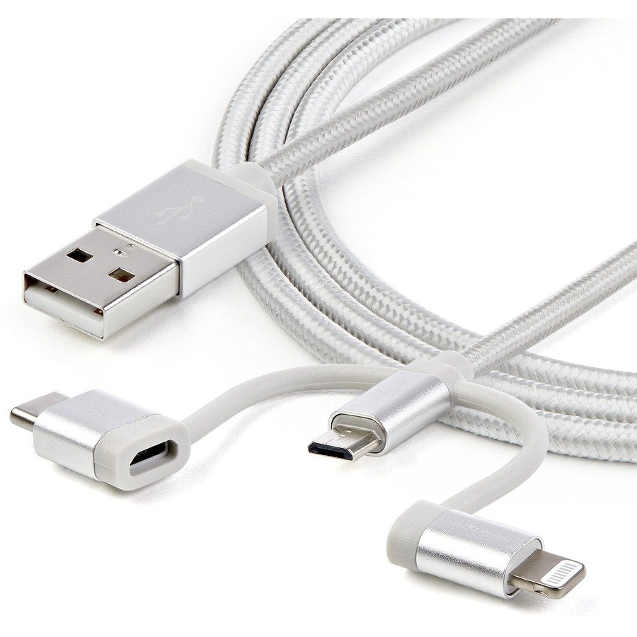 StarTech.com 1m USB Multi Charging Cable – Braided – Apple MFi Certified – USB 2.0 – Charge 1x device at a time – For USB-C or Lightning devices attach the corresponding connector of the cable to the Micro-USB connector and plug into your device – For Micro-USB devices plug the middle connector into your device
