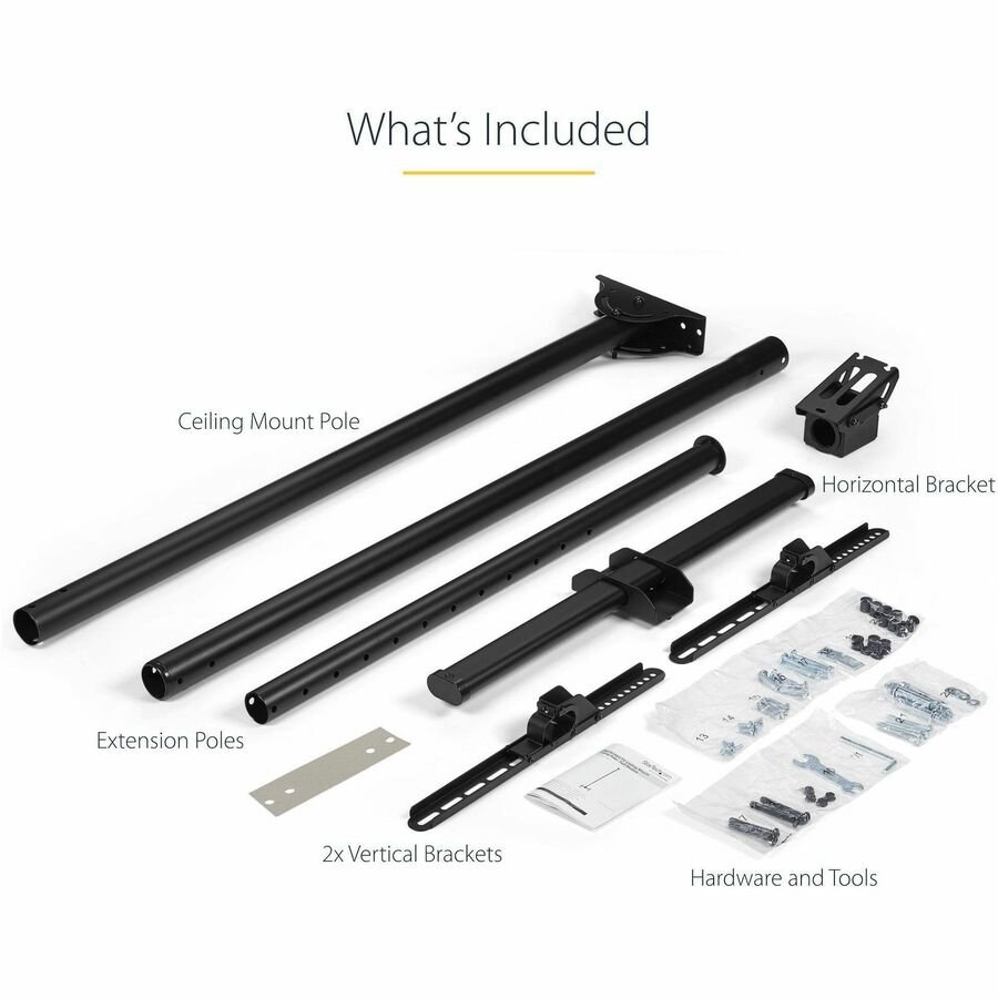 StarTech.com Ceiling TV Mount – 8.2′ to 9.8′ Long Pole – 32 to 75″ TVs with a weight capacity of up to 110 lb. (50 kg) – Telescopic pole can extend from 8.2 to 9.8′ (2.5 to 3 m) – Ceiling mount swivels +60 /-60 degrees to adjust to your ceiling – Swivel the display +180 /-180 degrees around the pole – Tilts