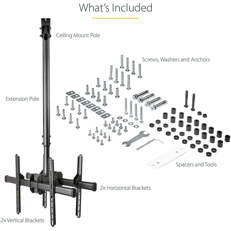 - WIDE RANGE OF MOTION: Ceiling TV mount allows for both displays to be swiveled 360? around the telescopic pole, and individually rotated +/-3? & tilted +5/-20?; TV position secured w/ provided tools