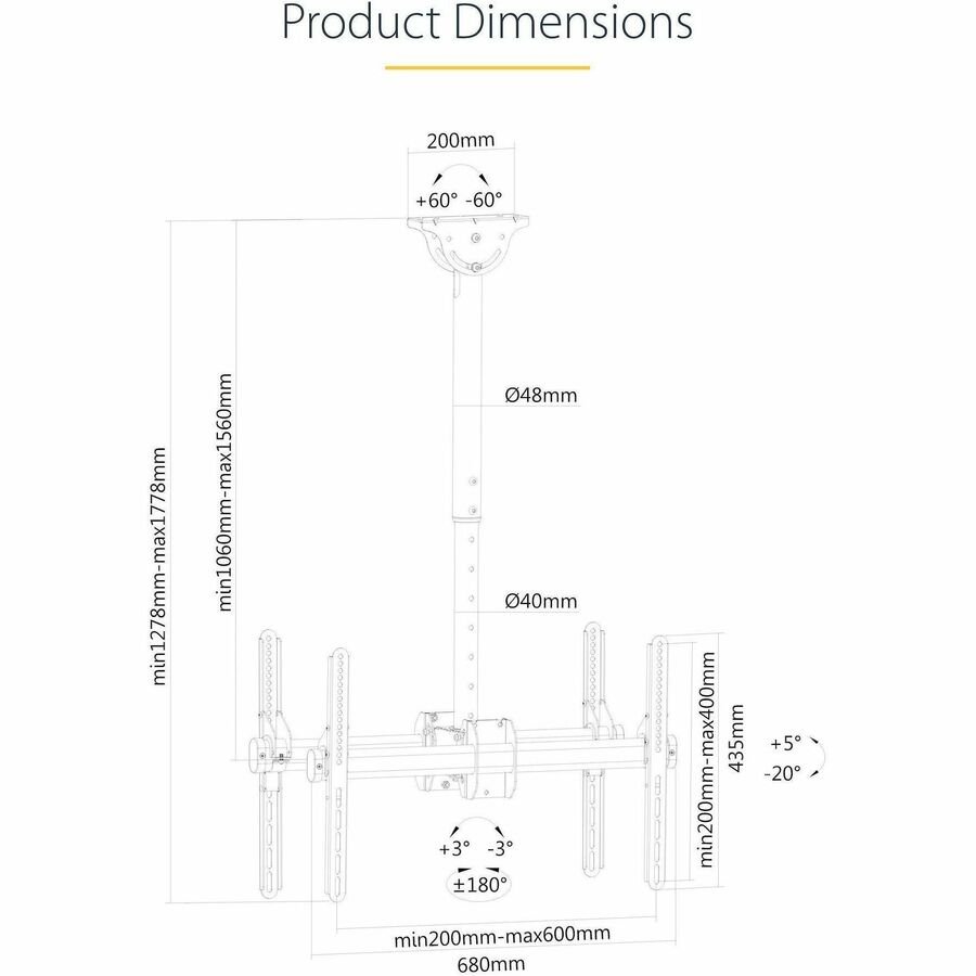 - VERSATILE INSTALLATION: Adjustable mounted ceiling bracket for multiple screens allows the pole to be adjusted and secured +/-60 degrees for angled/sloped/slanted ceilings to ensure displays are level