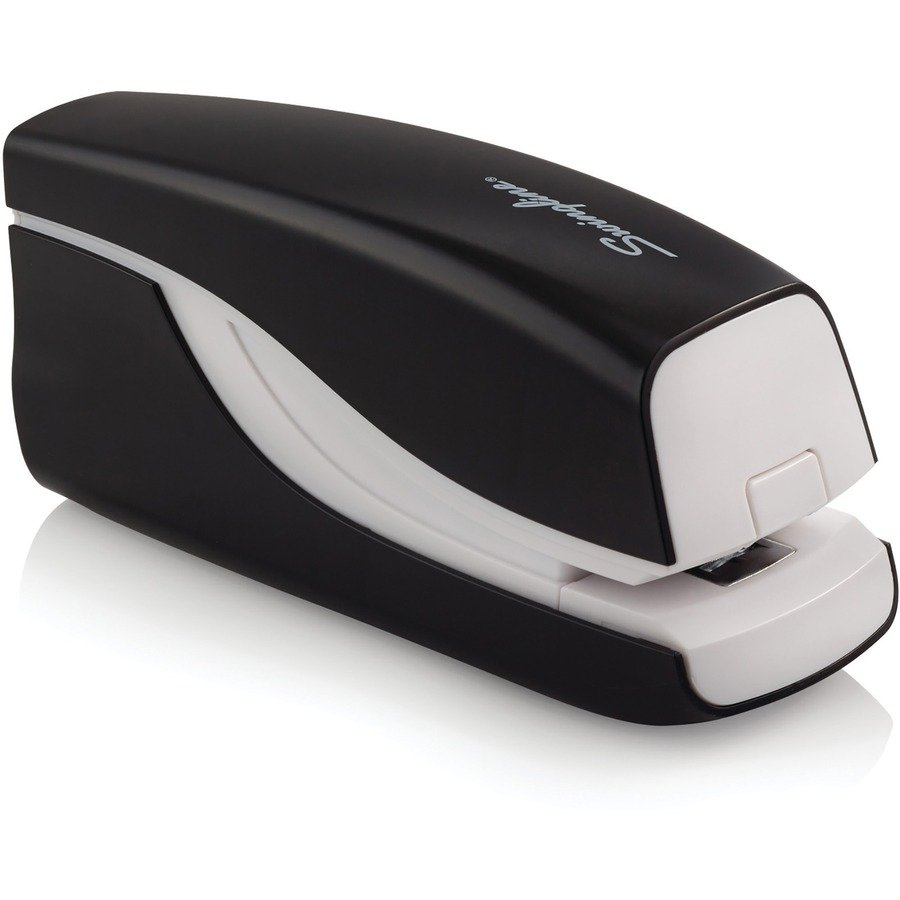 Marketing Information:Electric stapler fastens up to 20 sheets at a time with a smooth, motor-driven mechanism. Battery power is fueled by four AA batteries (sold separately). Stapler includes a low-battery light so you know when to change batteries. Clear-view window allows you to see where the staple will go. Design also includes push-button staple-loading for simplicity, a 105-staple capacity and 5/16″ throat depth. Electric stapler uses S.F. 3 premium staples.