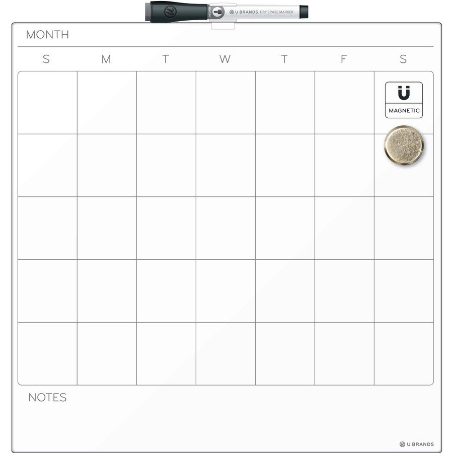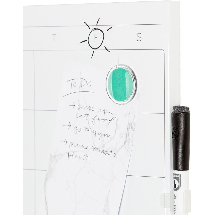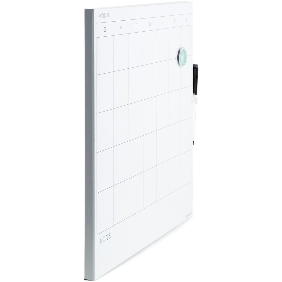 This frameless, magnetic dry-erase board is a perfect and functional solution to communicate messages with dry-erase markers in your office, school, classroom, home, college dorm room, coffee shop, restaurant or any commercial space. Using the U Brands dry-erase marker (sold separately) provides the ultimate mess-free writing and erasability experience. Monthly view enables you to keep track of your hectic schedule. The board’s magnetic writing surface functions as a bulletin board as well. Simply use any board magnets to pin all of your notes, messages, pictures, memos, calendars, menus, reminders and more. The silver aluminum frame provides a firm and rigid board construction.