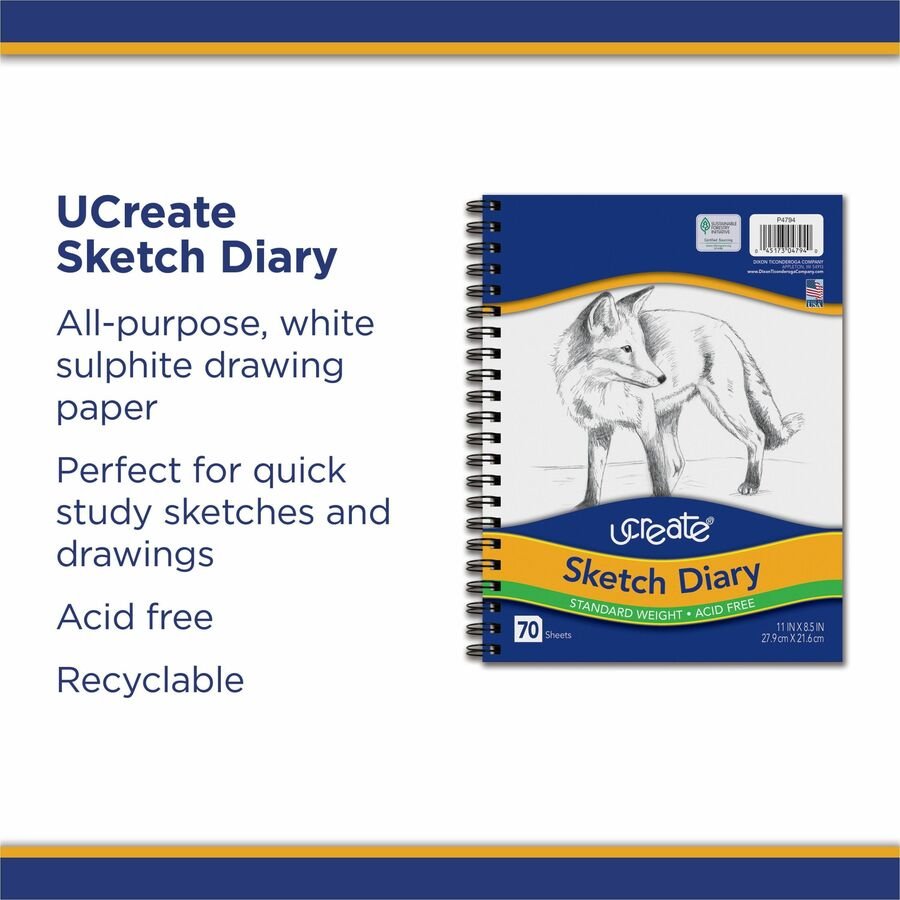 Sketch diary contains 70 sheets of medium-weight, sulphite drawing paper that is ideal for all dry media. Each all-purpose white sheet is acid-free and recyclable. Spiral binding on the side works well for portable sketching. Diary is perfect for quick-study sketches and drawings.