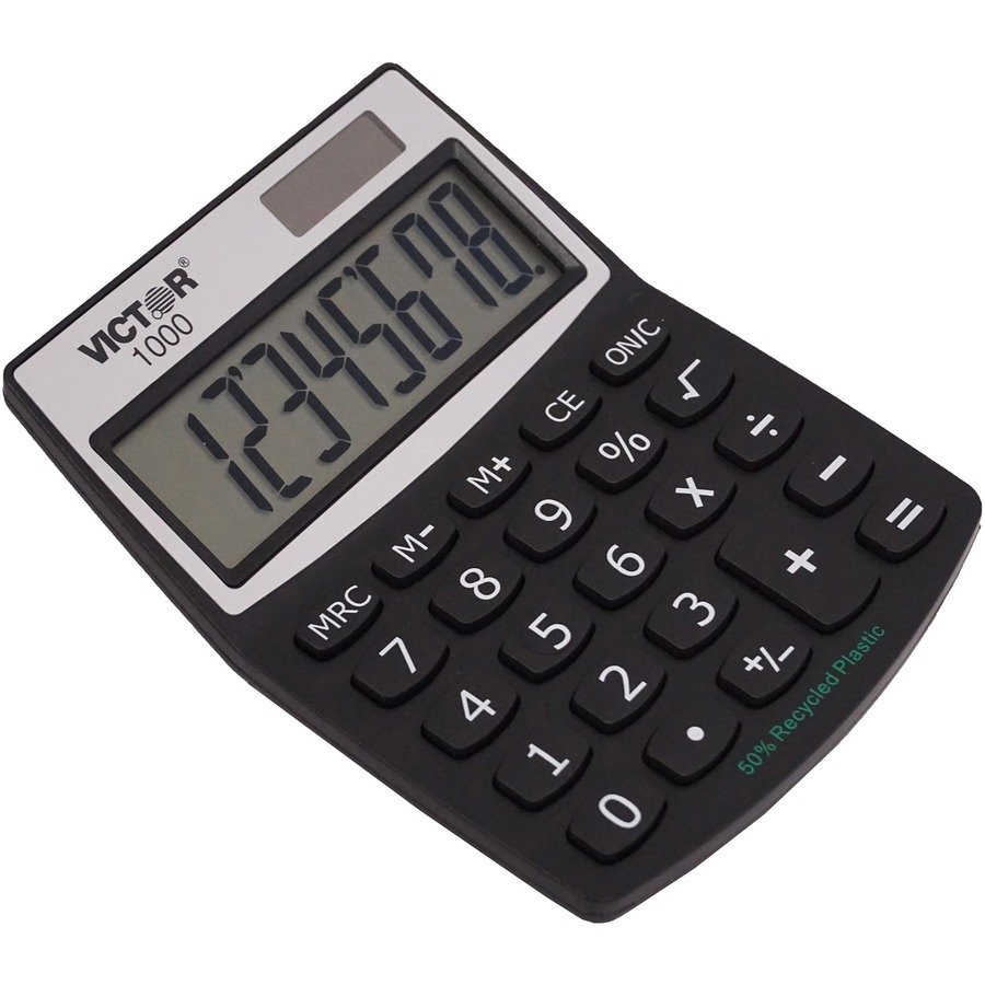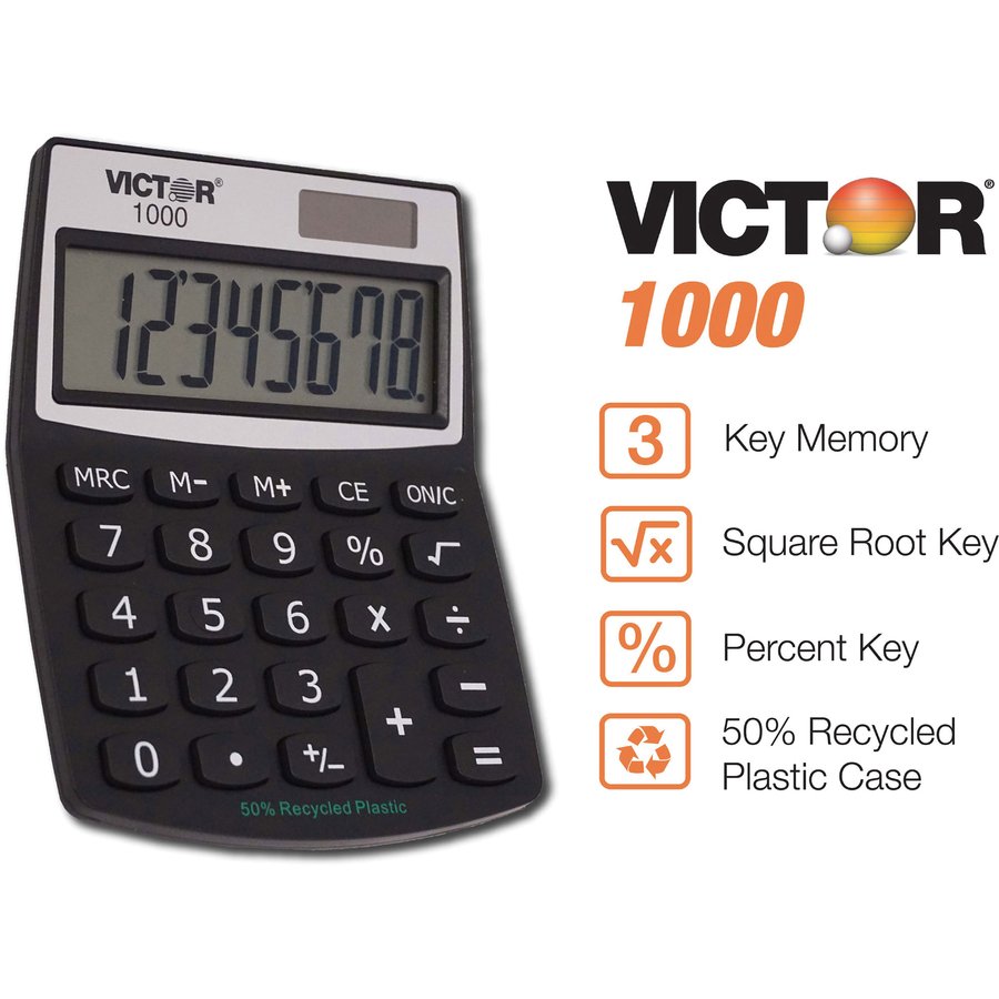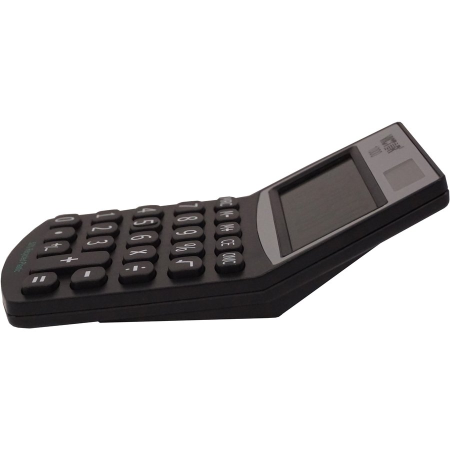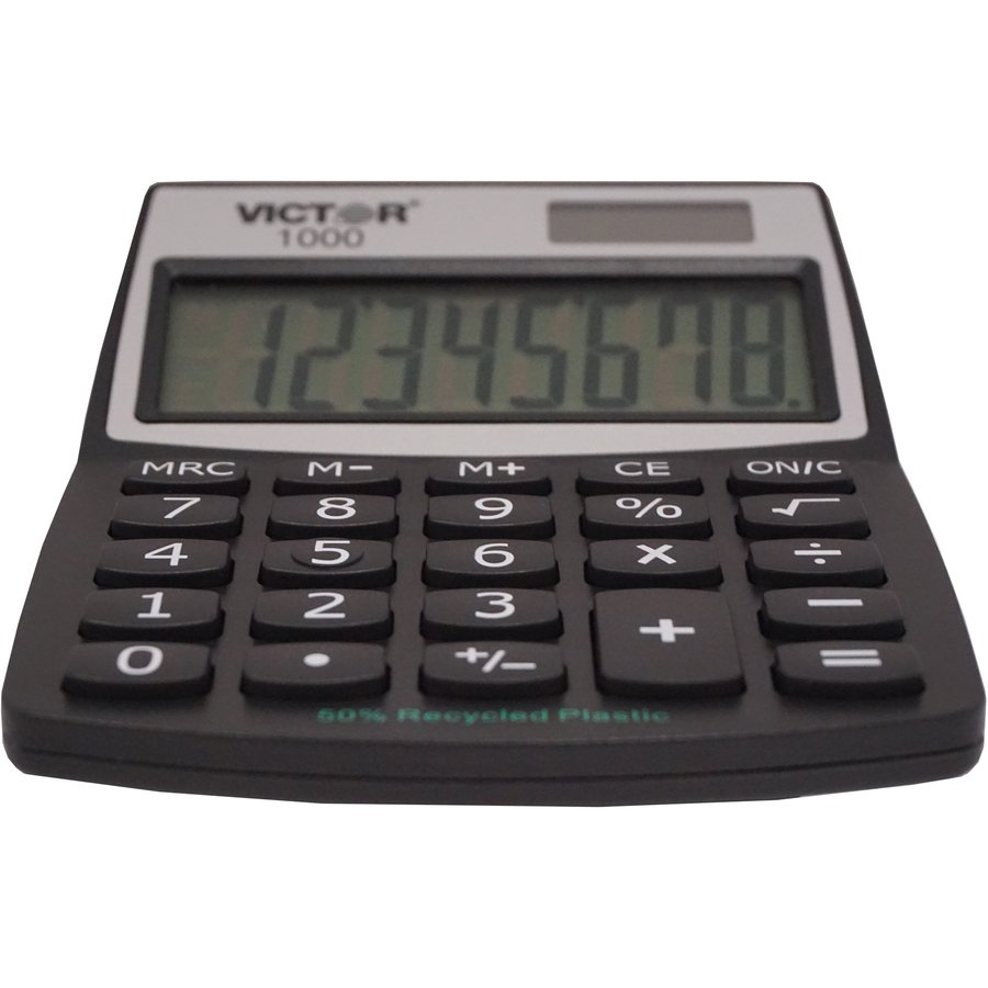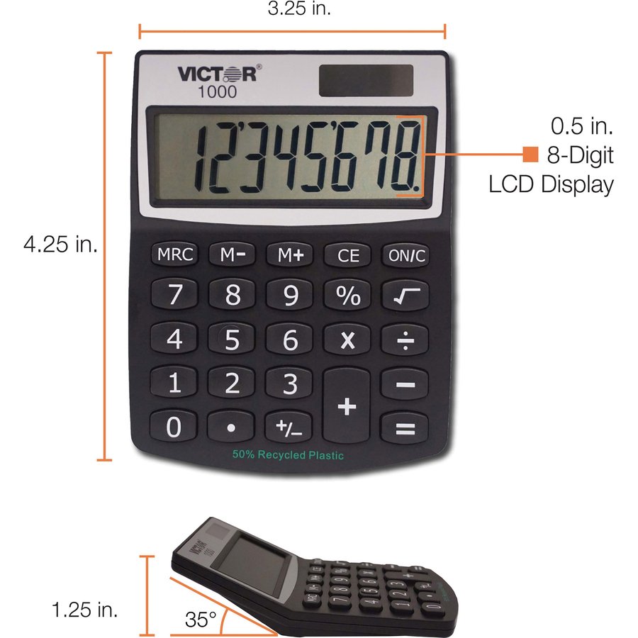 8-Digit Mini Desktop Calculator is made with a high percentage of recycled plastic. Extra-large angled LCD has full 18mm display digits. Functions include addition, subtraction, multiplication, constant multiplication, division, percentage, percentage add-on, discount calculations and three-key independent memory. Calculator has soft plastic keys and runs on solar power with battery backup.