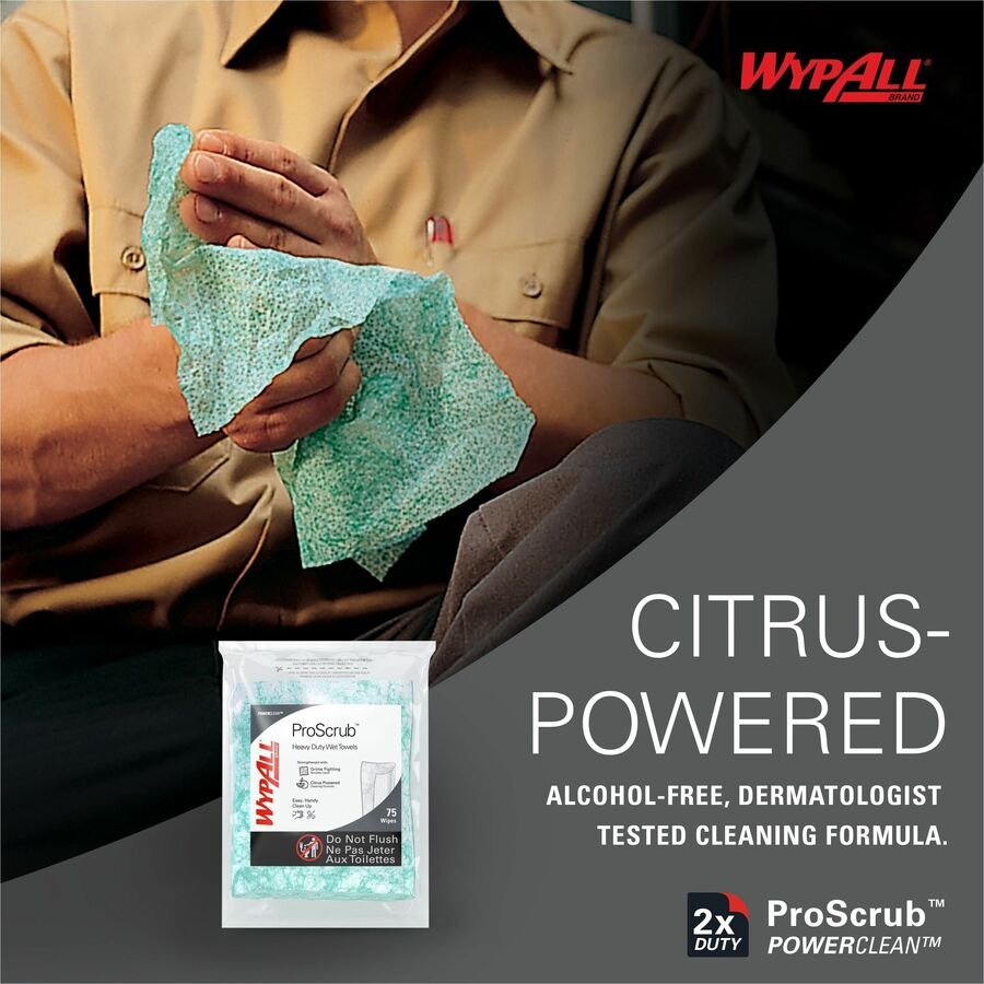 Marketing Information:Power Clean ProScrub Refill Wipes are an ideal, presaturated cleaner for on-the-go hand cleaning. Alcohol-free, natural citrus solvents cut through grease, grime and oil. Specially designed cleaning fabric incorporates a textured surface on one side to increase scrubbing action for more thorough cleaning. It’s thin and flexible enough to get into tight spaces. Other side features a smooth surface to wipe away dirt from your hand. Middle, absorbent layer soaks up and holds the dirt. These wipers are a must-have solution for dirty jobs and cleaning on-the-go. Refill your Kimberly-Clark Power Clean ProScrub Canister (not included) with these wipes.